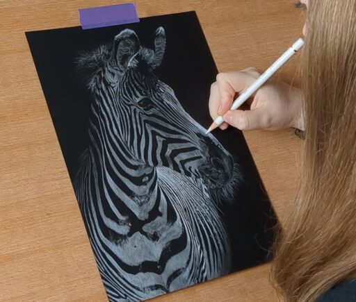 Strich für Strich führe ich durch die Techniken, um Fellstrukturen, Glanzlichter oder Schattierungen plastisch hervortreten zu lassen. Die besondere Wirkung auf schwarzem Papier eröffnet ganz neue Möglichkeiten und lädt ein, das Zeichnen einmal anders zu erleben.